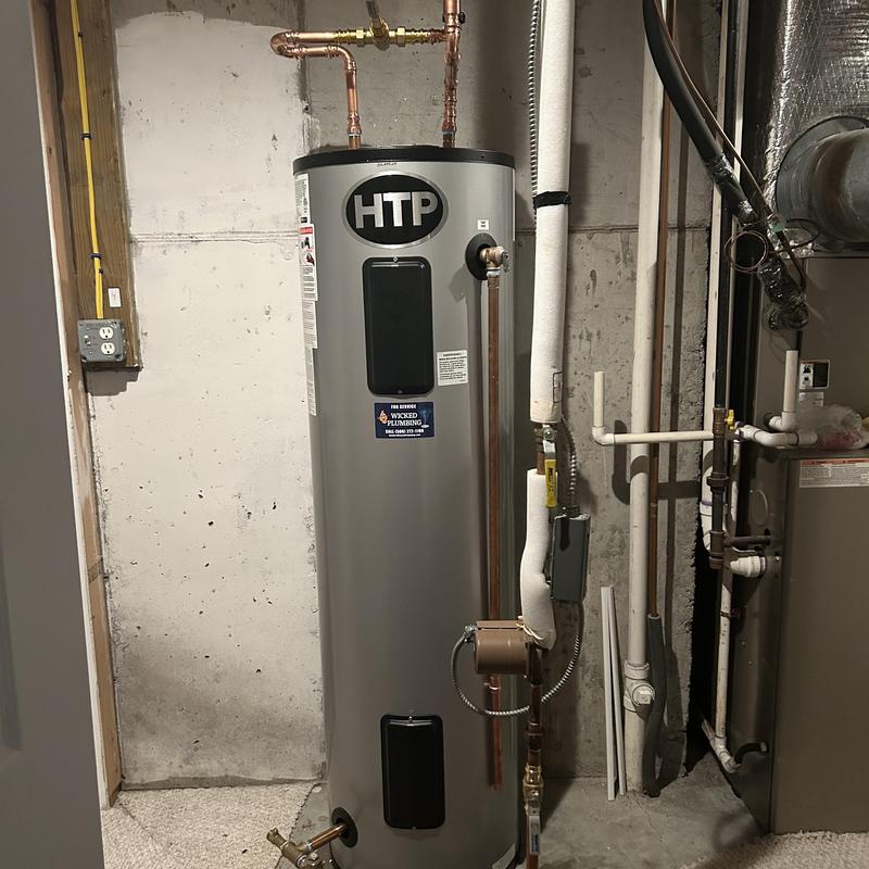 Wicked Plumbing replaced a leaking gas water heater and mixing valve with a new HTP Everlast stainless steel electric model in Bristol, Rhode Island. The team also repiped the circulation pump and installed a new thermostatic mixing valve to improve system reliability and performance.