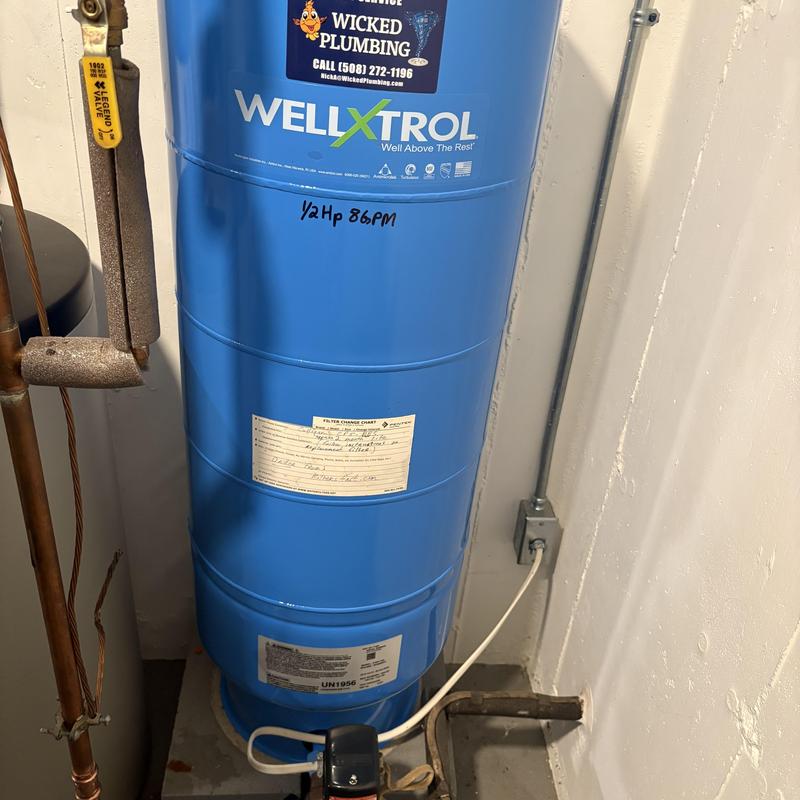 Wicked Plumbing replaced a failed well tank in Tiverton, Rhode Island. The team identified a punctured diaphragm that caused short cycling and risked pump failure. Technicians installed a new well tank along with a well tee and pressure switch to restore system function.