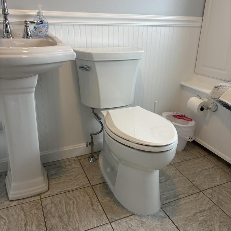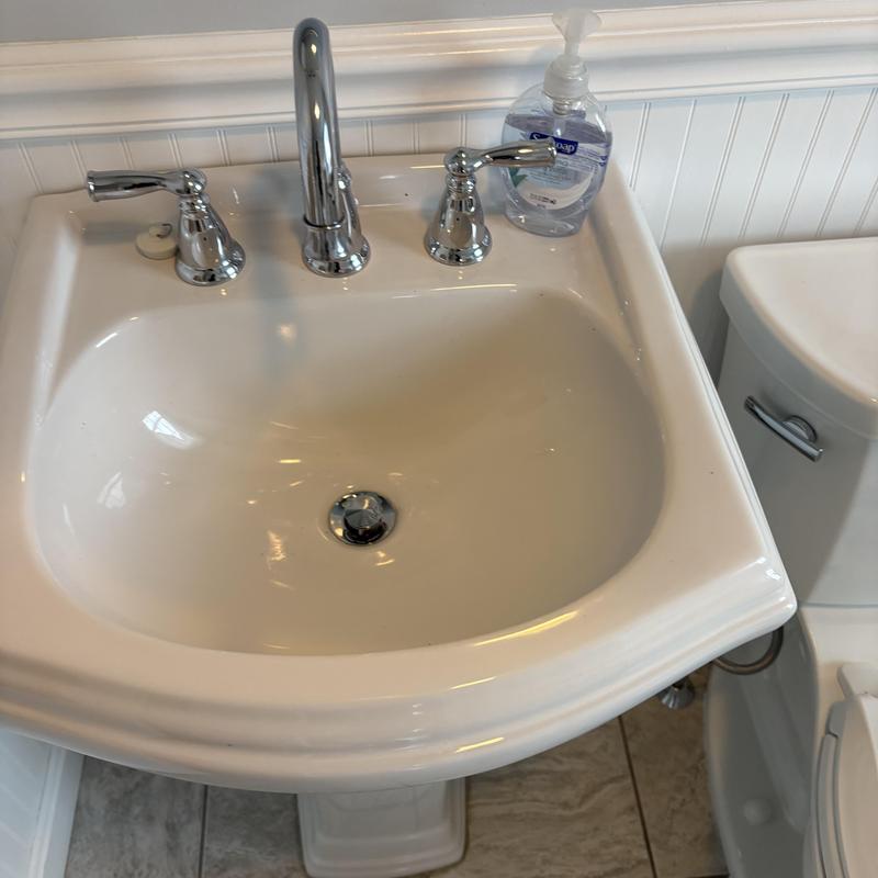 Wicked Plumbing installed a Kohler Highline comfort height toilet and a new shut-off valve in South Kingstown, Rhode Island. The team also replaced a broken pop-up drain on a pedestal sink with a solid brass assembly for improved function and durability.