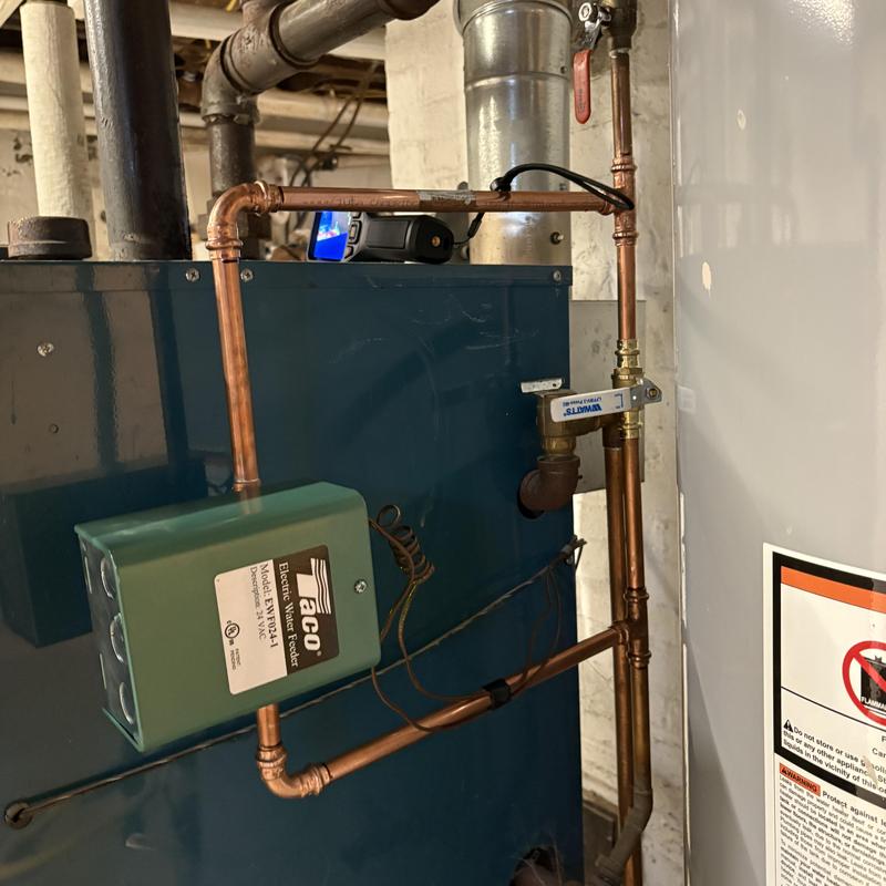 A service plumber in East Providence, Rhode Island installed an automatic water feeder on a steam boiler that ran out of water. The customer was unfamiliar with steam boiler operation, so the plumber also explained how the system works.