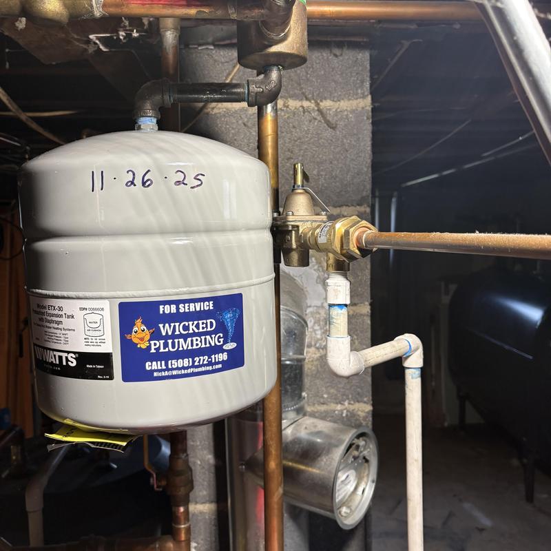Wicked Plumbing replaced a failed expansion tank, backflow pressure regulator combination, and relief valve on a residential boiler system in Fall River, Massachusetts. The repair addressed high boiler pressure and water discharge caused by component failure after a nearby water main repair. The water heater showed no signs of damage and remained functional.